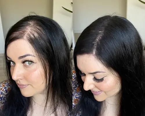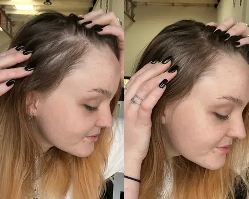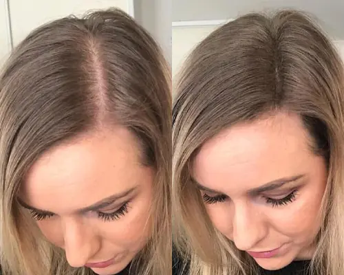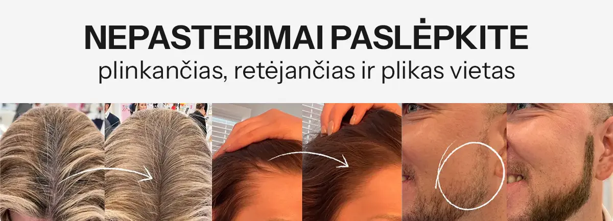 Rekomendacija: jei abejojate tarp dviejų atspalvių, rinkitės šiek tiek tamsesnį – jis paprastai atrodo natūraliau ir geriau maskuoja praretėjusias vietas.