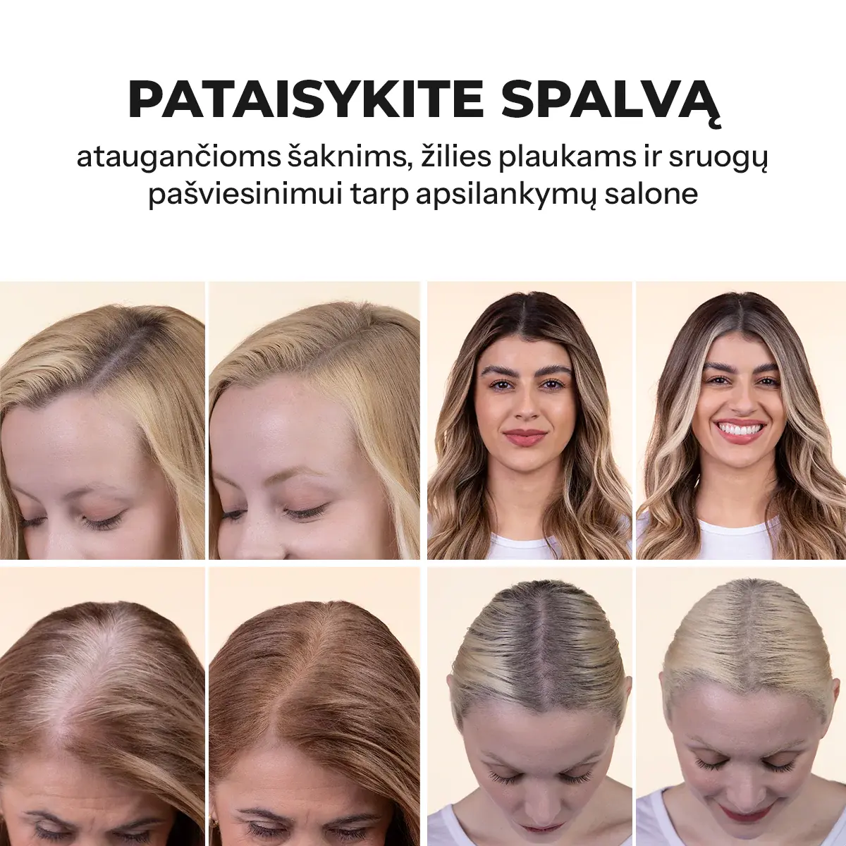 Jei turite sruogų ar kelių tonų plaukus, orientuokitės į vyraujančią šaknų spalvą.